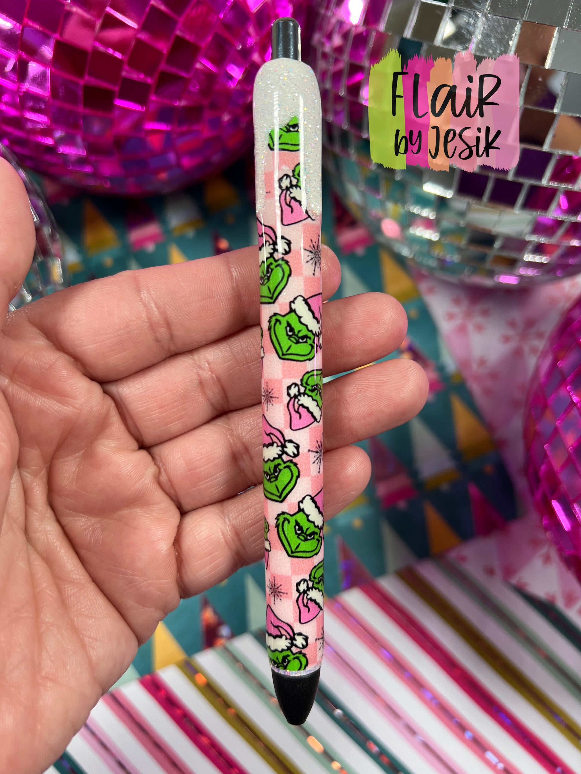 Pink and White Plaid Grinch Pen with White Glittered Drip