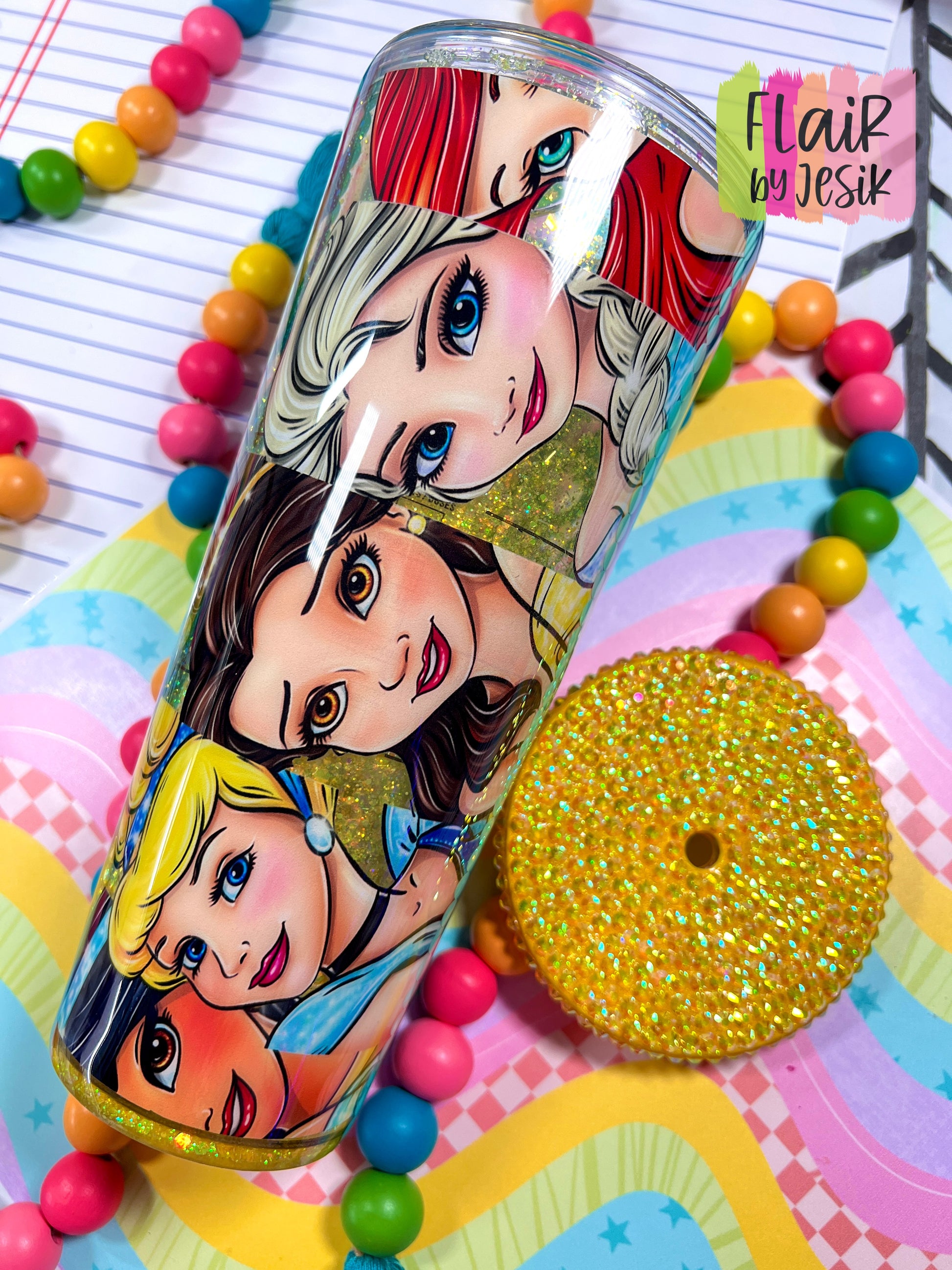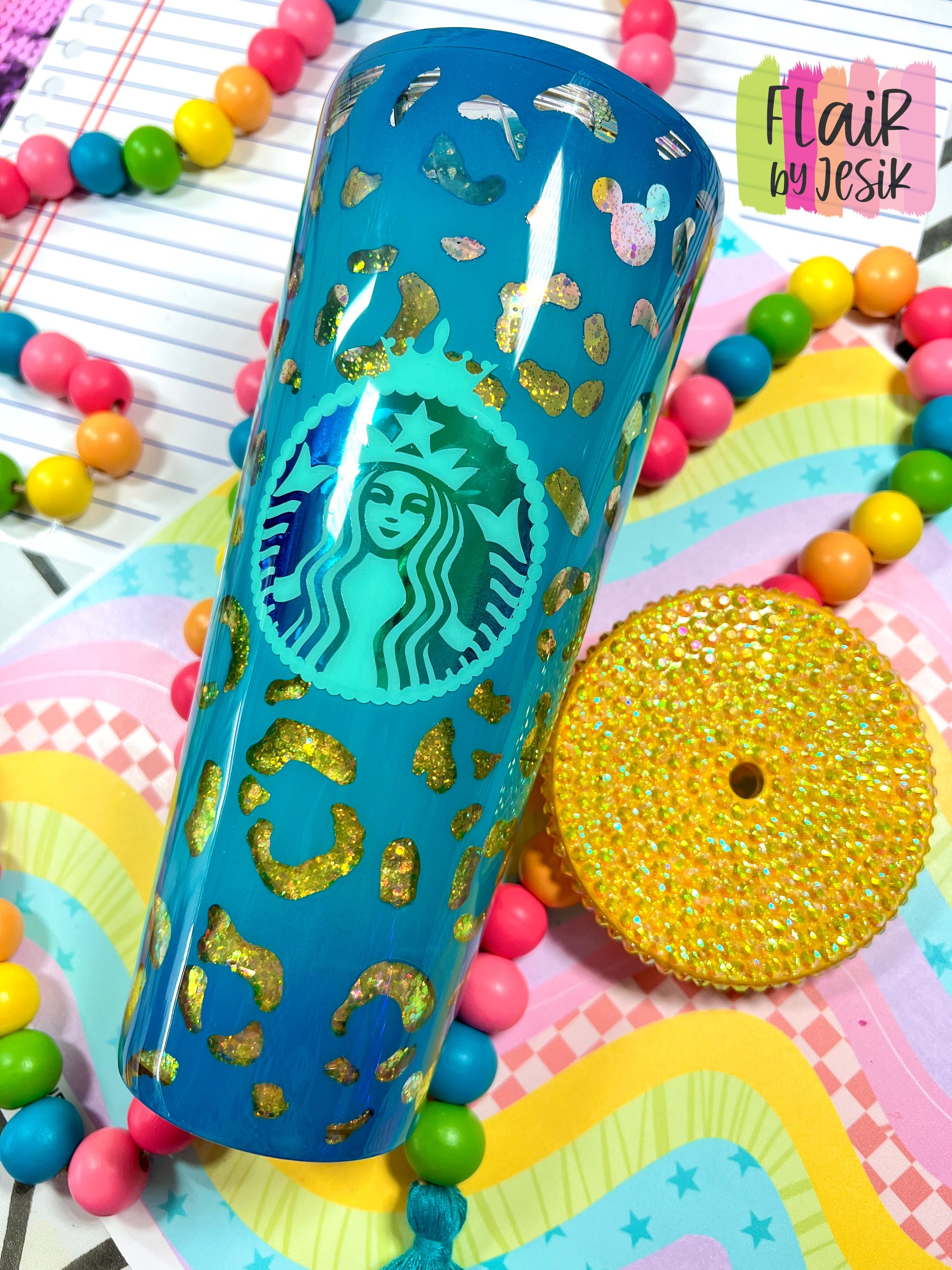 Filled with yellow glitter and decorated with half princess images and half ombre painted in teal leopard spots. Includes lid with bling and plastic straw.